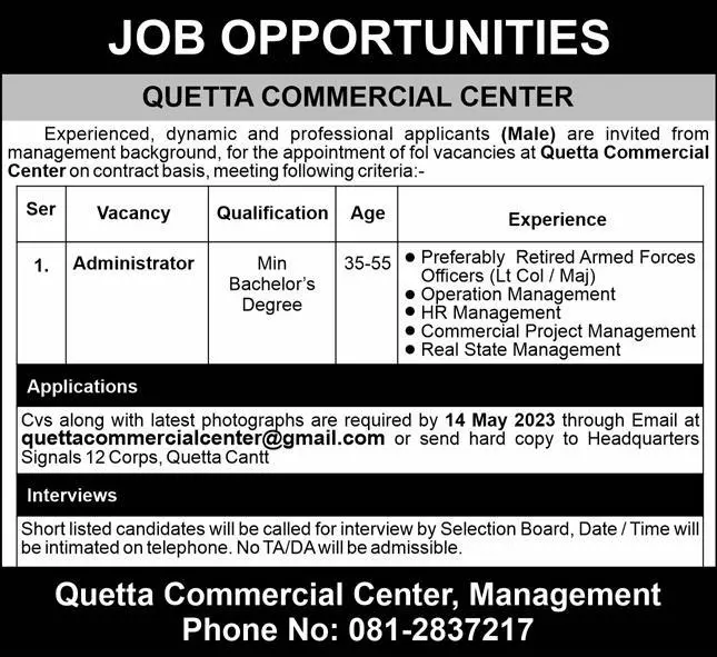 Quetta Commercial Centre Quetta Jobs 2023 announce the Contract career opportunities for the post of See Below Ad in Balochistan, Quetta for the fresh and experienced candidates on Contract basis who have Check Advertisement degree. Posted date of this post is 10/05/2023 and the last date is 14/05/2023. if you are eligible for this job apply before due date.