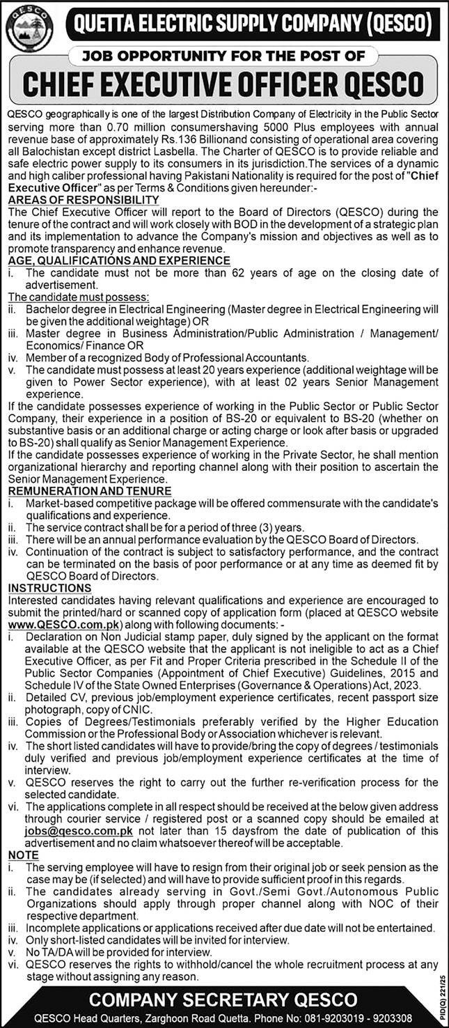 QESCO geographically is one of the largest Distribution Company of Electricity in the Public Sector serving more than 0.70 million consumers having 5000 Plus employees with annual revenue base of approximately Rs. 136 Billion and consisting of operational area covering all Balochistan except district Lasbella. The Charter of QESCO is to provide reliable and safe electric power supply to its consumers in its jurisdiction. The services of a dynamic and high caliber professional having Pakistani Nationality is required for the post of "Chief Executive Officer" as per Terms & Conditions given hereunder:-
