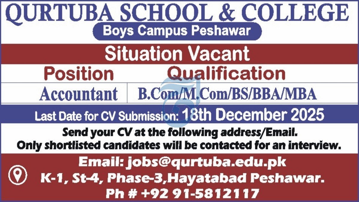 Qurtuba School & College Peshawar Job 2026 announce the Contract career opportunities for the post of See Below Ad in Khyber Pakhtunkhwa, Peshawar for the fresh and experienced candidates on Contract basis who have Check Advertisement degree. Posted date of this post is 17/12/2025 and the last date is 18/12/2025. if you are eligible for this job apply before due date.