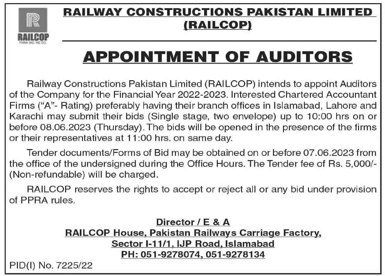- Railway Constructions Pakistan Limited (RAILCOP) intends to appoint Auditors of the Company for the Financial Year 2022-2023. Interested Chartered Accountant Firms ("A"- Rating) preferably having their branch offices in Islamabad, Lahore and Karachi may submit their bids (Single stage, two envelope) up to 10:00 hrs on or before 08.06.2023 (Thursday). The bids will be opened in the presence of the firms or their representatives at 11:00 hrs. on same day.