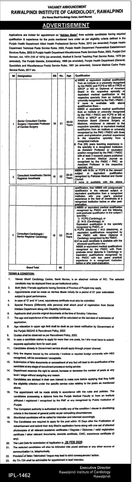 Rawalpindi Institute Of Cardiology Jobs 2026 announce the Contract career opportunities for the post of See Below Ad in Punjab, Rawalpindi for the fresh and experienced candidates on Contract basis who have Check Advertisement degree. Posted date of this post is 11/02/2026 and the last date is 28/02/2026. if you are eligible for this job apply before due date.