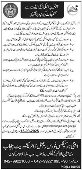 Regional Directorate Anti Narcotics Force ANF Jobs 2025 announce the Contract career opportunities for the post of See Below Ad in Punjab, Lahore for the fresh and experienced candidates on Contract basis who have Check Advertisement degree. Posted date of this post is 30/08/2025 and the last date is 13/09/2025. if you are eligible for this job apply before due date.