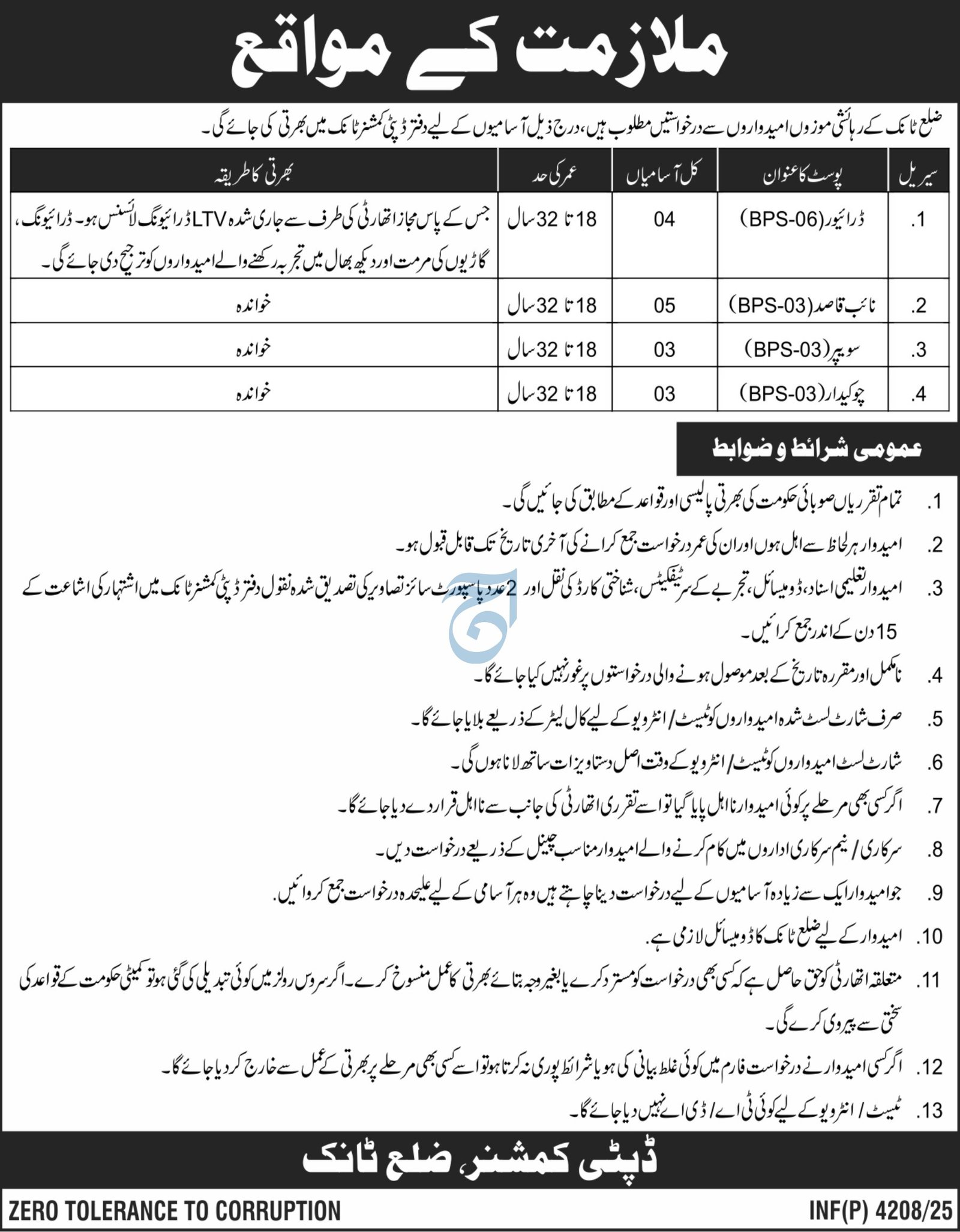 Applications are invited from suitable candidates who are residents of District Tank for the following posts to be filled in the office of the Deputy Commissioner, Tank.
