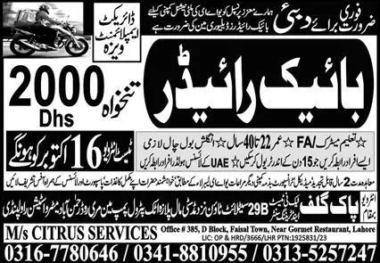 Rider & Bike Rider Jobs 2023 In Dubai announce the Contract career opportunities for the post of See Below Ad in Dubai for the fresh and experienced candidates on Contract basis who have Check Advertisement degree. Posted date of this post is 14/10/2023 and the last date is 16/10/2023. if you are eligible for this job apply before due date.