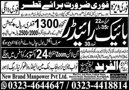 Rider & Bike Rider Jobs 2023 In Qatar announce the Contract career opportunities for the post of See Below Ad in Qatar for the fresh and experienced candidates on Contract basis who have Check Advertisement degree. Posted date of this post is 19/10/2023 and the last date is 24/10/2023. if you are eligible for this job apply before due date.