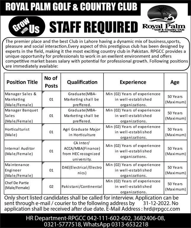 - Royal Palm Golf & Country Club Lahore, lahore Punjab Pakistan invites applications from eligible candidates for the post of manager marketing, manager banquet sales, maintenance engineer, internal auditor, horticulturist, chef de partie and manager sales as per advertisement of December 20, 2022 published in daily Express Newspaper. Candidates with CA, MBA, Bachelor, Master, Middle, Matric, DAE and ACCA etc. educational background will be preferred.