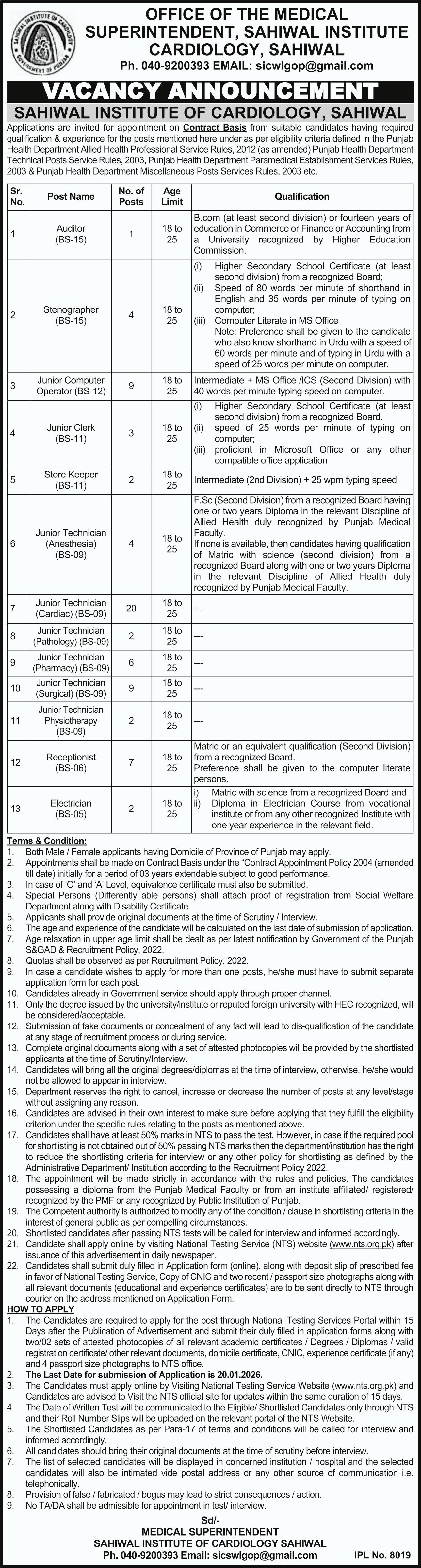 Sahiwal Institute Of Cardiology SIC Jobs 2026 announce the Contract career opportunities for the post of See Below Ad in Punjab, Sahiwal for the fresh and experienced candidates on Contract basis who have Check Advertisement degree. Posted date of this post is 30/12/2025 and the last date is 20/01/2026. if you are eligible for this job apply before due date.