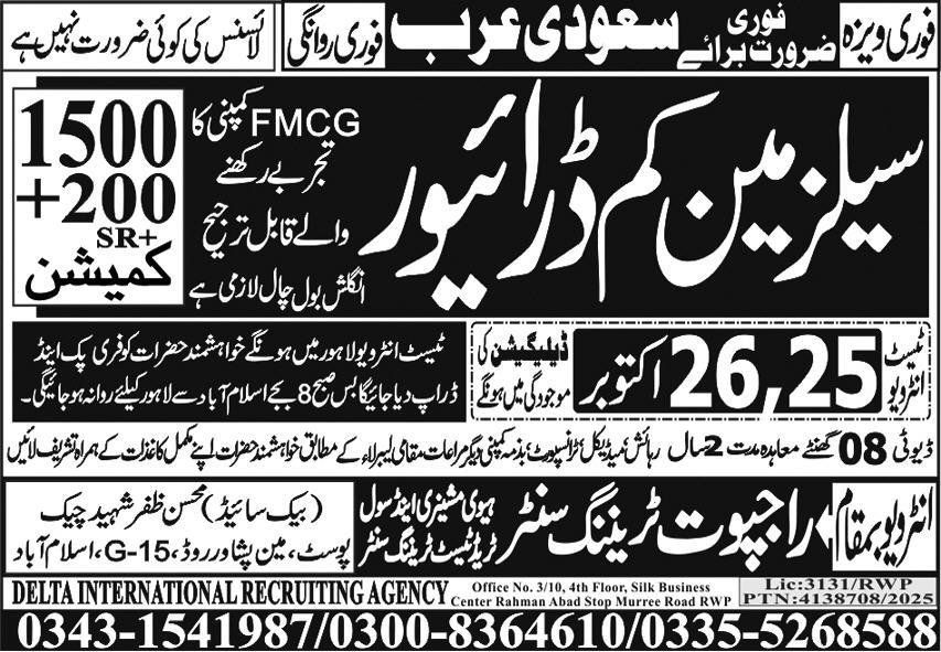 Saleman kum driver Jobs in Saudia Arabia 2025 announce the Contract career opportunities for the post of See Below Ad in Saudi Arabia for the fresh and experienced candidates on Contract basis who have Check Advertisement degree. Posted date of this post is 23/10/2025 and the last date is 26/10/2025. if you are eligible for this job apply before due date.