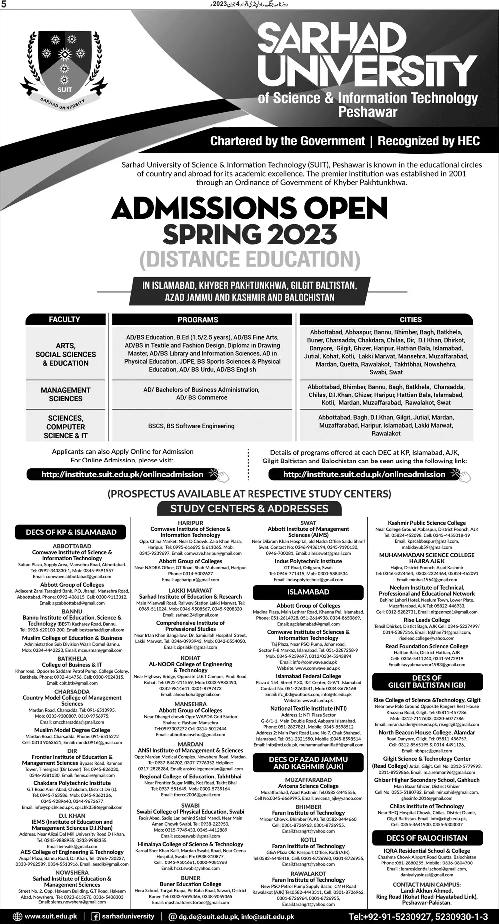 Sarhad University of Science and Information Admissions announce the Contract career opportunities for the post of See Below Ad in Khyber Pakhtunkhwa, Peshawar for the fresh and experienced candidates on Contract basis who have Check Advertisement degree. Posted date of this post is 04/06/2023 and the last date is 30/06/2023. if you are eligible for this job apply before due date.