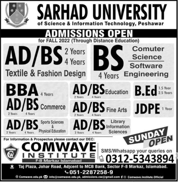 Sarhad University of Science & Information Admission 2022 announce the Contract career opportunities for the post of See Below Ad in Khyber Pakhtunkhwa, Peshawar for the fresh and experienced candidates on Contract basis who have Check Advertisement degree. Posted date of this post is 24/10/2022 and the last date is 24/11/2022. if you are eligible for this job apply before due date.