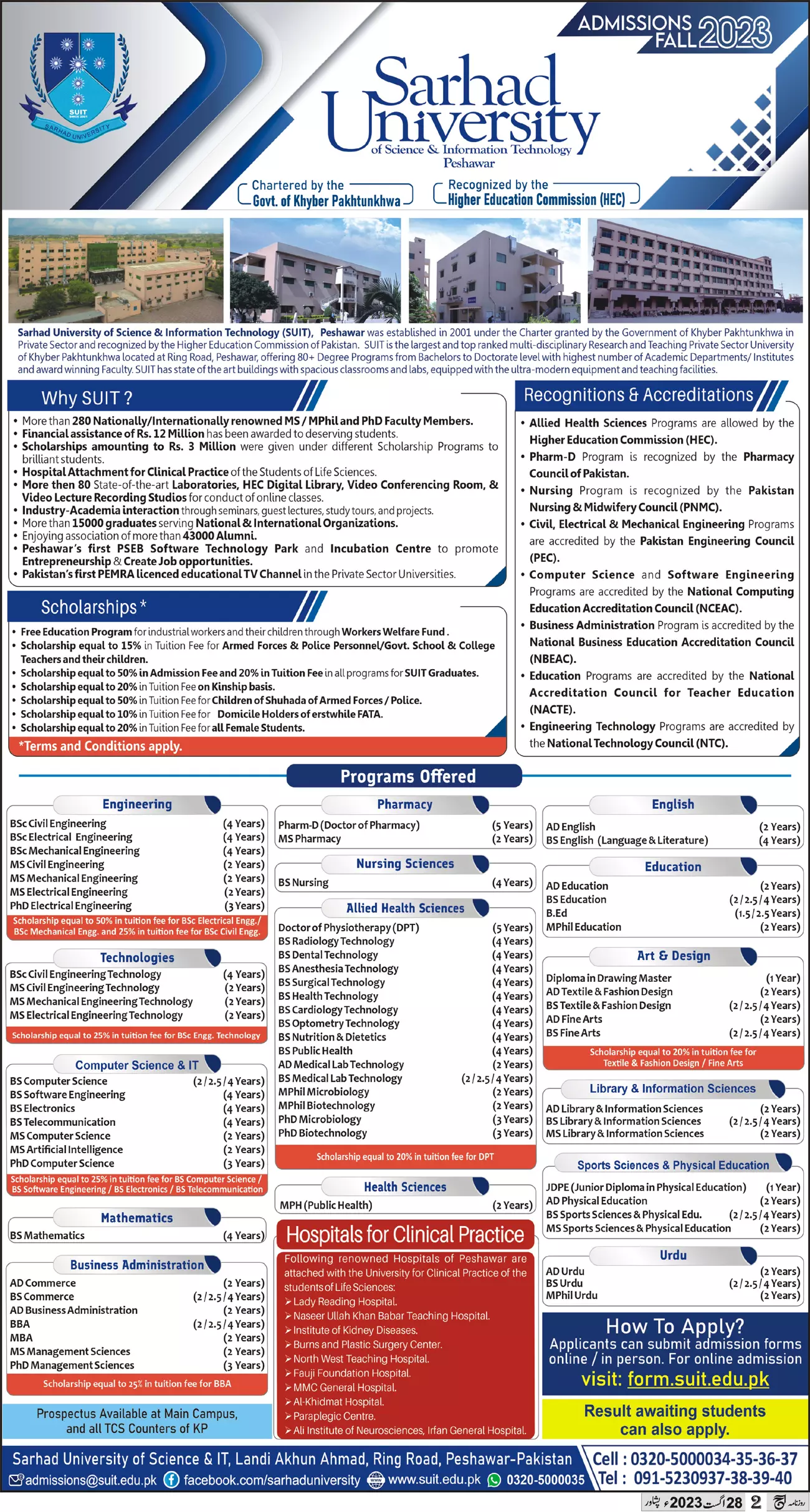 Sarhad University of Science & Information Admissions 2023 announce the Contract career opportunities for the post of See Below Ad in Khyber Pakhtunkhwa, Peshawar for the fresh and experienced candidates on Contract basis who have Check Advertisement degree. Posted date of this post is 28/08/2023 and the last date is 28/09/2023. if you are eligible for this job apply before due date.