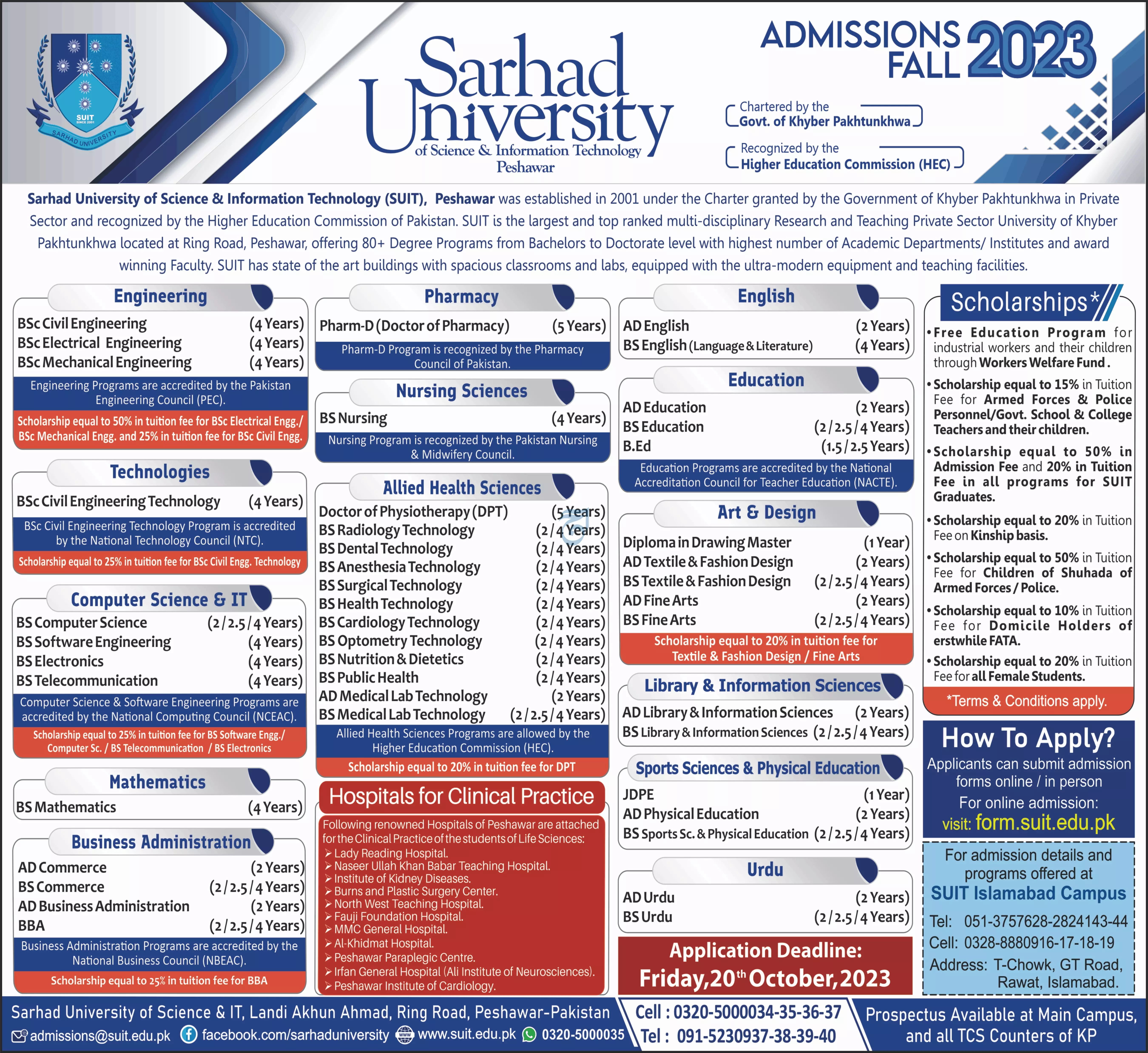 Sarhad University of Science & Information Admissions 2023 announce the Contract career opportunities for the post of See Below Ad in Khyber Pakhtunkhwa, Peshawar for the fresh and experienced candidates on Contract basis who have Check Advertisement degree. Posted date of this post is 09/10/2023 and the last date is 20/10/2023. if you are eligible for this job apply before due date.