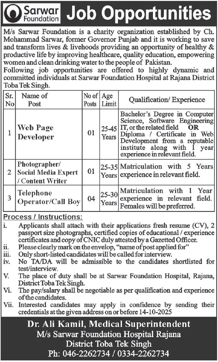 Following job opportunities are offered to highly dynamic and committed individuals at Sarwar Foundation Hospital at Rajana District Toba Tek Singh.