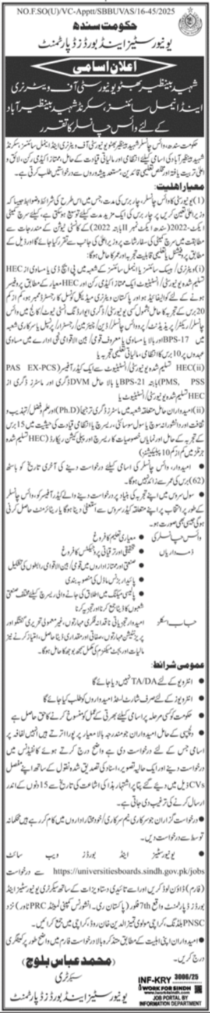 The Shaheed Benazir Bhutto University of Veterinary and Animal Sciences, Sakrand, Shaheed Benazirabad, invites applications from dynamic, financially astute, highly qualified, and experienced professionals with academic and research expertise for the position of Vice Chancellor.