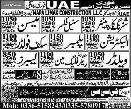 Scaffolder & Mason Job 2025 In UAE announce the Contract career opportunities for the post of See Below Ad in United Arab Emirates for the fresh and experienced candidates on Contract basis who have Check Advertisement degree. Posted date of this post is 07/08/2025 and the last date is 08/08/2025. if you are eligible for this job apply before due date.