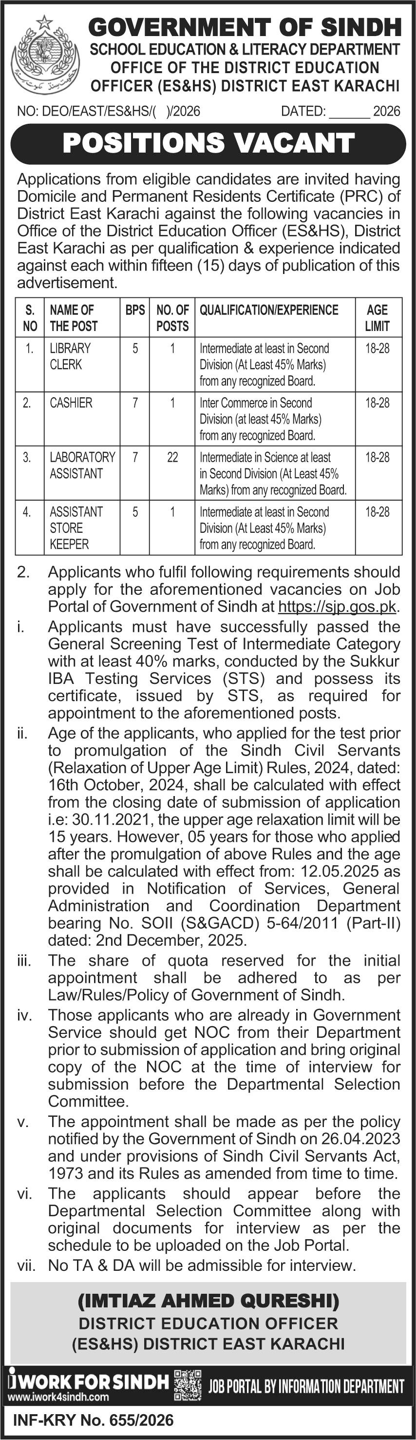 Applications from eligible candidates are invited having Domicile and Permanent Residents Certificate (PRC) of District East Karachi against the following vacancies in Office of the District Education Officer (ES&HS), District East Karachi as per qualification & experience indicated against each within fifteen (15) days of publication of this advertisement.