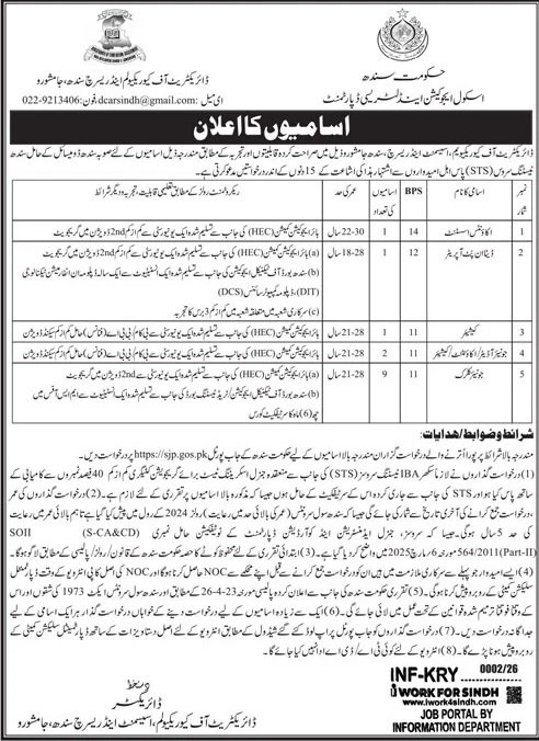 The Directorate of Curriculum, Assessment & Research, Sindh Jamshoro, invites applications from eligible candidates holding a Sindh domicile who have passed the Sindh Testing Service (STS) test, according to the qualifications and experience specified below, within 15 days of the publication of this advertisement.