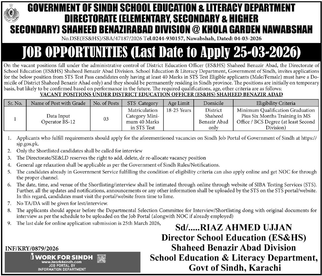 School Education & Literacy Department Khola Garden Jobs announce the Contract career opportunities for the post of See Below Ad in Sindh, Shaheed Benazirabad for the fresh and experienced candidates on Contract basis who have Check Advertisement degree. Posted date of this post is 05/03/2026 and the last date is 25/03/2026. if you are eligible for this job apply before due date.