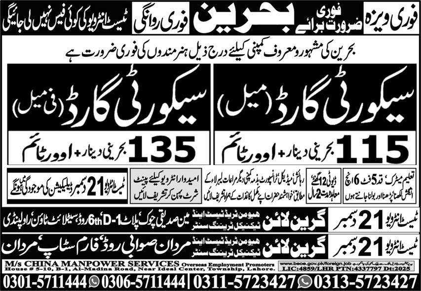 Security Guard jobs in Bahrain 2025 announce the Contract career opportunities for the post of See Below Ad in Bahrain for the fresh and experienced candidates on Contract basis who have Check Advertisement degree. Posted date of this post is 20/12/2025 and the last date is 21/12/2025. if you are eligible for this job apply before due date.