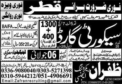 Security Guard Jobs in Qatar 2023 announce the Contract career opportunities for the post of See Below Ad in Qatar for the fresh and experienced candidates on Contract basis who have Check Advertisement degree. Posted date of this post is 04/07/2023 and the last date is 06/07/2023. if you are eligible for this job apply before due date.