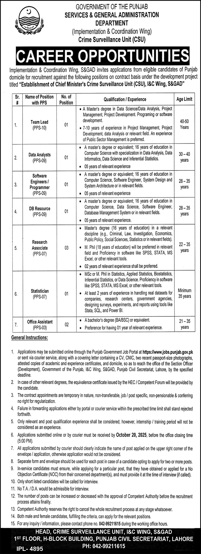 Implementation & Coordination Wing, S&GAD invites applications from eligible candidates of Punjab domicile for recruitment against the following positions on contract basis under the development project titled "Establishment of Chief Minister's Crime Surveillance Unit (CSU), I&C Wing, S&GAD"