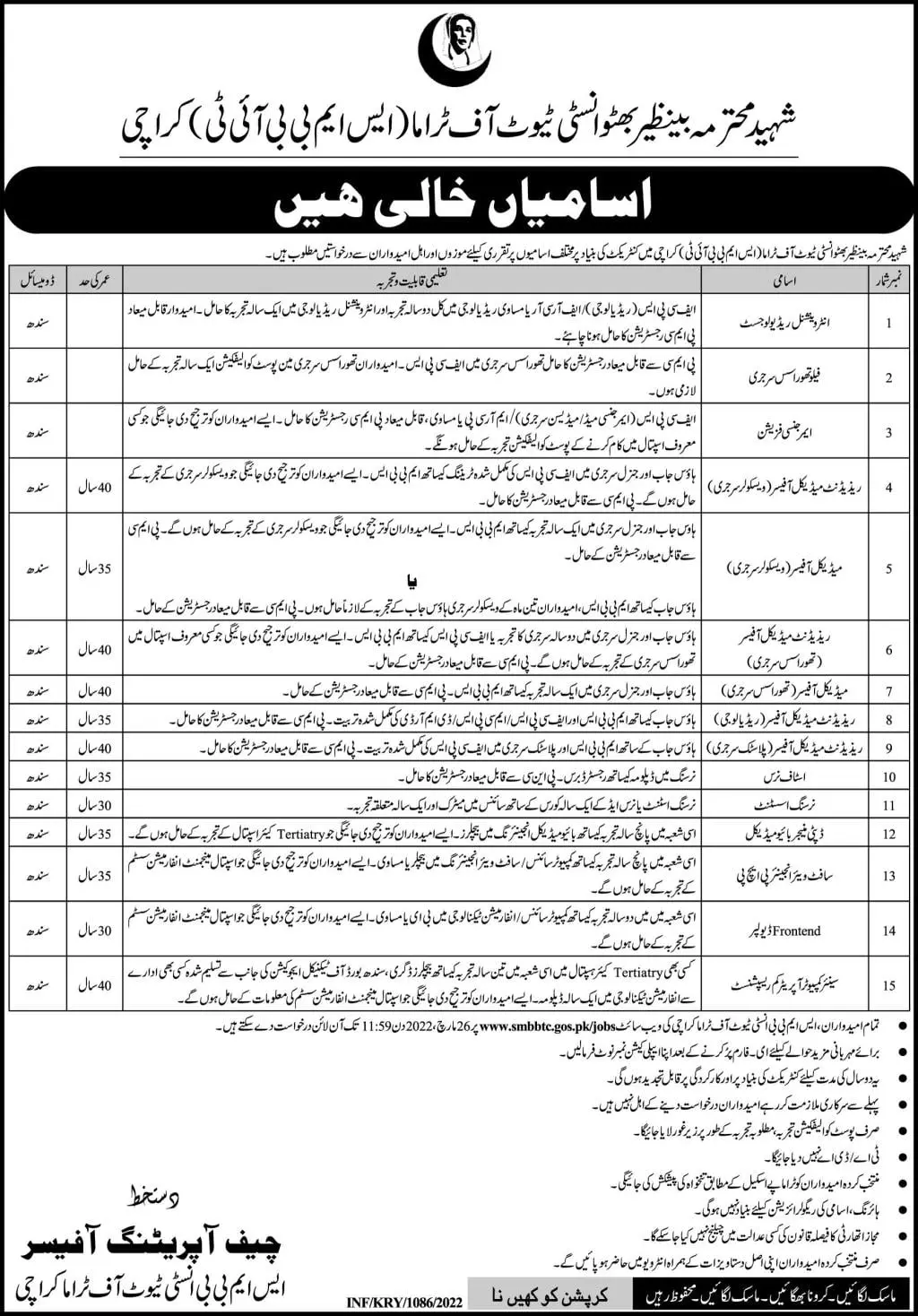 Shaheed Mohtarma Benazir Bhutto Institute Of Trauma Jobs announce the Contract career opportunities for the post of See Below Ad in Sindh, Karachi for the fresh and experienced candidates on Contract basis who have Check Advertisement degree. Posted date of this post is 06/03/2022 and the last date is 26/03/2022. if you are eligible for this job apply before due date.