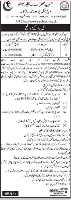 Shaheed Mohtarma Benazir Medical University Larkana Jobs announce the Contract career opportunities for the post of See Below Ad in Sindh, Larkana for the fresh and experienced candidates on Contract basis who have Check Advertisement degree. Posted date of this post is 08/02/2026 and the last date is 24/02/2026. if you are eligible for this job apply before due date.