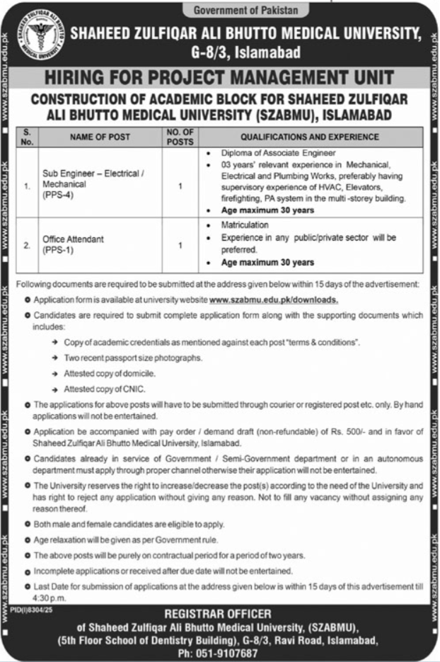 Shaheed Zulfiqar Ali Bhutto Medical University SZABMU Jobs announce the Contract career opportunities for the post of See Below Ad in Federal, Islamabad for the fresh and experienced candidates on Contract basis who have Check Advertisement degree. Posted date of this post is 15/04/2026 and the last date is 30/04/2026. if you are eligible for this job apply before due date.