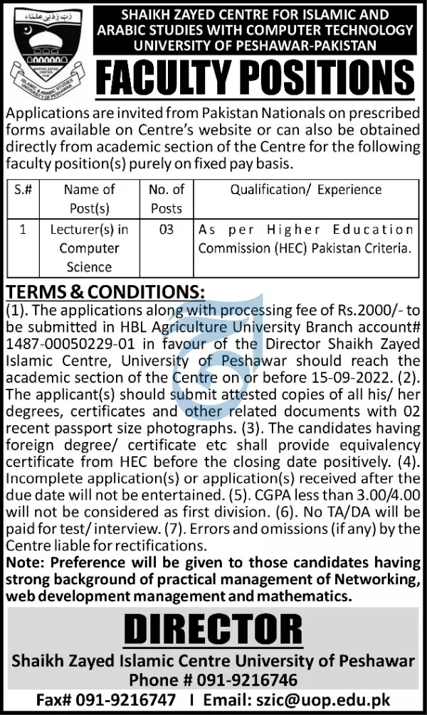The current situation vacant notice of the University of Peshawar is seeking applications to hire Teaching Faculty for Shaikh Zayed Centre for Islamic & Arabic Studies with Computer Computer Technology. Jobs are opening for Lecturers – Computer Sciences.