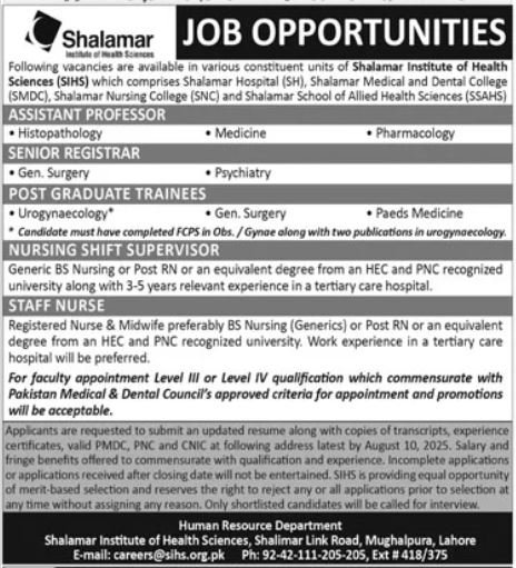 Shalamar Institute Of Health Sciences Lahore Jobs 2025 announce the Contract career opportunities for the post of See Below Ad in Punjab, Lahore for the fresh and experienced candidates on Contract basis who have Check Advertisement degree. Posted date of this post is 07/08/2025 and the last date is 22/08/2025. if you are eligible for this job apply before due date.