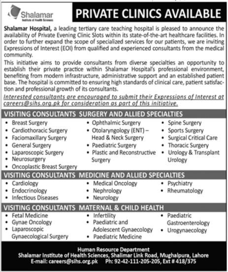 Shalamar Hospital, a leading tertiary care teaching hospital is pleased to announce the availability of Private Evening Clinic Slots within its state-of-the-art healthcare facilities. In order to further expand the scope of specialized services for our patients, we are inviting Expressions of Interest (EOI) from qualified and experienced consultants from the medical community.