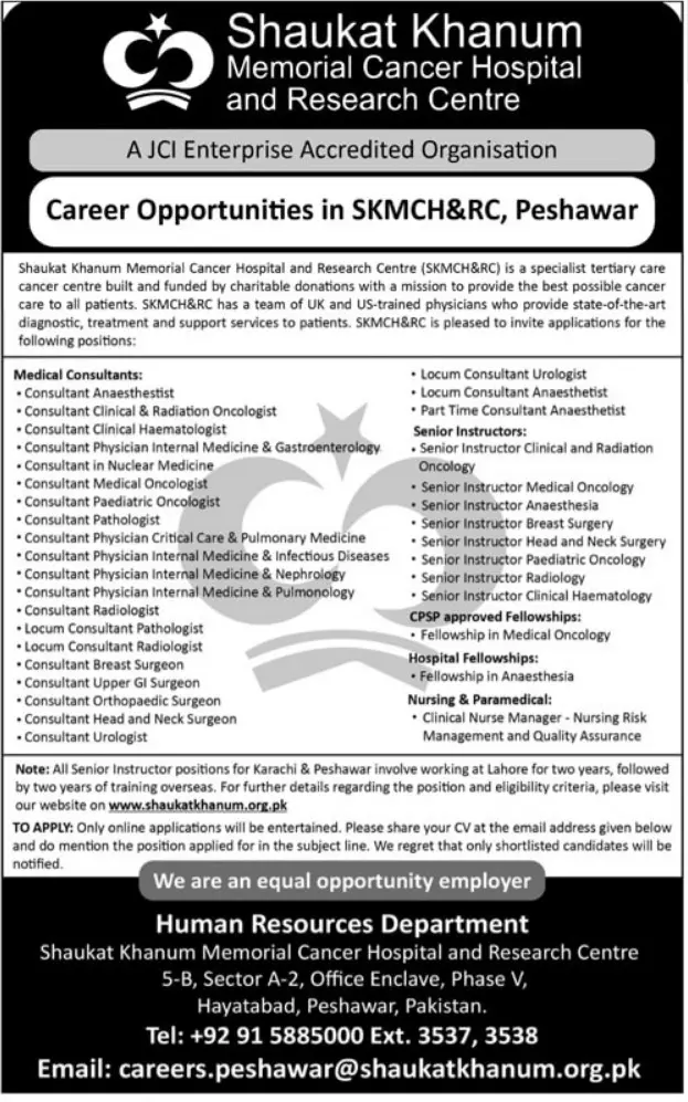 - Shaukat Khanum Cancer Hospital is looking to hire applications for Medical Consultants, Senior Instructors, CPSP Approved Fellowships, Hospital Fellowships, Assistant Director Nursing, Senior Nursing Lecturer, Trainee Medical Technician CSSD, Team Leaders, Transport Executives, Transport Supervisors, Carpenters, Electricians, Office Coordinators, Maintenance Technicians, Senior Bio-Medical Engineers, Assistant Bio-Medical Engineers, and Information Security Officers.
