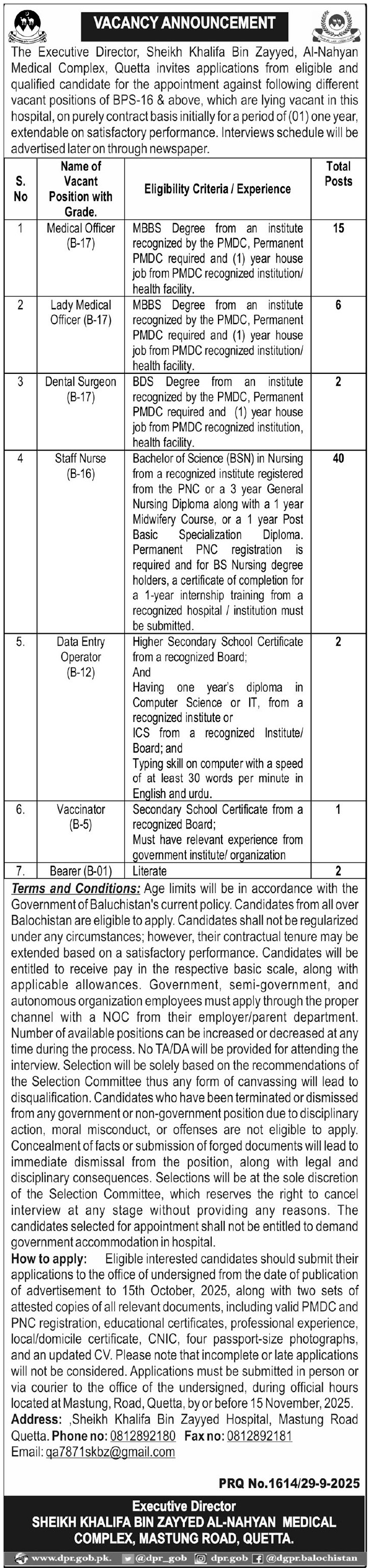 Sheikh Khalifa Bin Zayed Al Nahyan Medical Complex Jobs 2025 announce the Contract career opportunities for the post of See Below Ad in Balochistan, Quetta for the fresh and experienced candidates on Contract basis who have Check Advertisement degree. Posted date of this post is 30/09/2025 and the last date is 15/10/2025. if you are eligible for this job apply before due date.