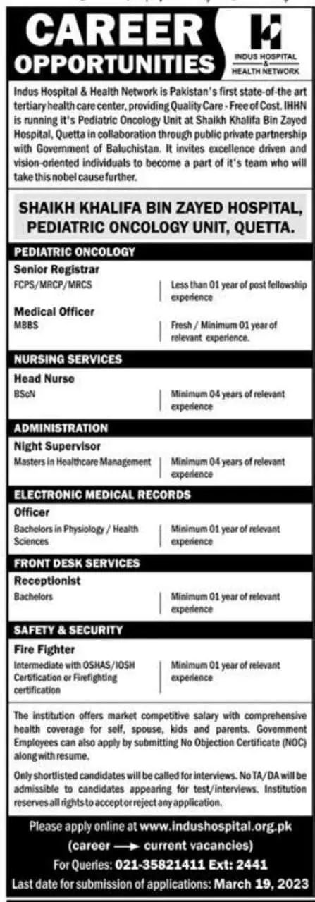 Sheikh Khalifah Bin Zayyad Hospital Quetta Jobs 2023 announce the Contract career opportunities for the post of See Below Ad in Balochistan,Quetta for the fresh and experienced candidates on Contract basis who have Check Advertisement degree. Posted date of this post is 12/03/2023 and the last date is 19/03/2023. if you are eligible for this job apply before due date.