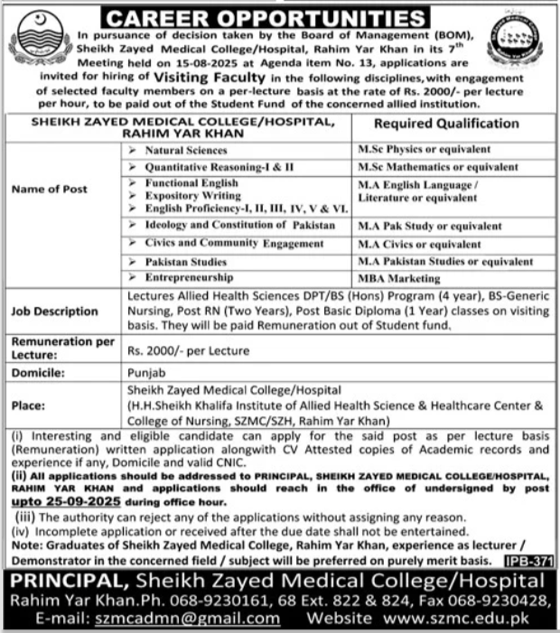 CAREER OPPORTUNITIES In pursuance of decision taken by the Board of Management (BOM), Sheikh Zayed Medical College/Hospital, Rahim Yar Khan in its 7th Meeting held on 15-08-2025 at Agenda item No. 13, applications are invited for hiring of Visiting Faculty in the following disciplines, with engagement of selected faculty members on a per-lecture basis at the rate of Rs. 2000/- per lecture per hour, to be paid out of the Student Fund of the concerned allied institution.