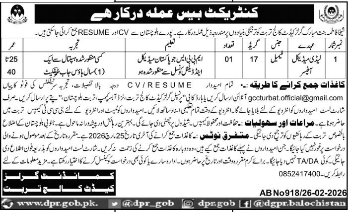 Sheikha Fatima Bint Mubarak Girls Cadet College Turbat Job announce the Contract career opportunities for the post of See Below Ad in Balochistan, Turbat for the fresh and experienced candidates on Contract basis who have Check Advertisement degree. Posted date of this post is 27/02/2026 and the last date is 26/03/2026. if you are eligible for this job apply before due date.