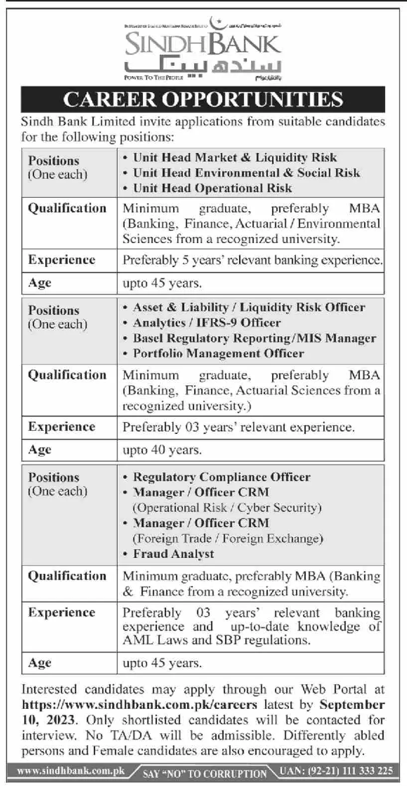 Interested candidates may apply through our Web Portal at https://www.sindhbank.com.pk/careers latest by September 10, 2023.