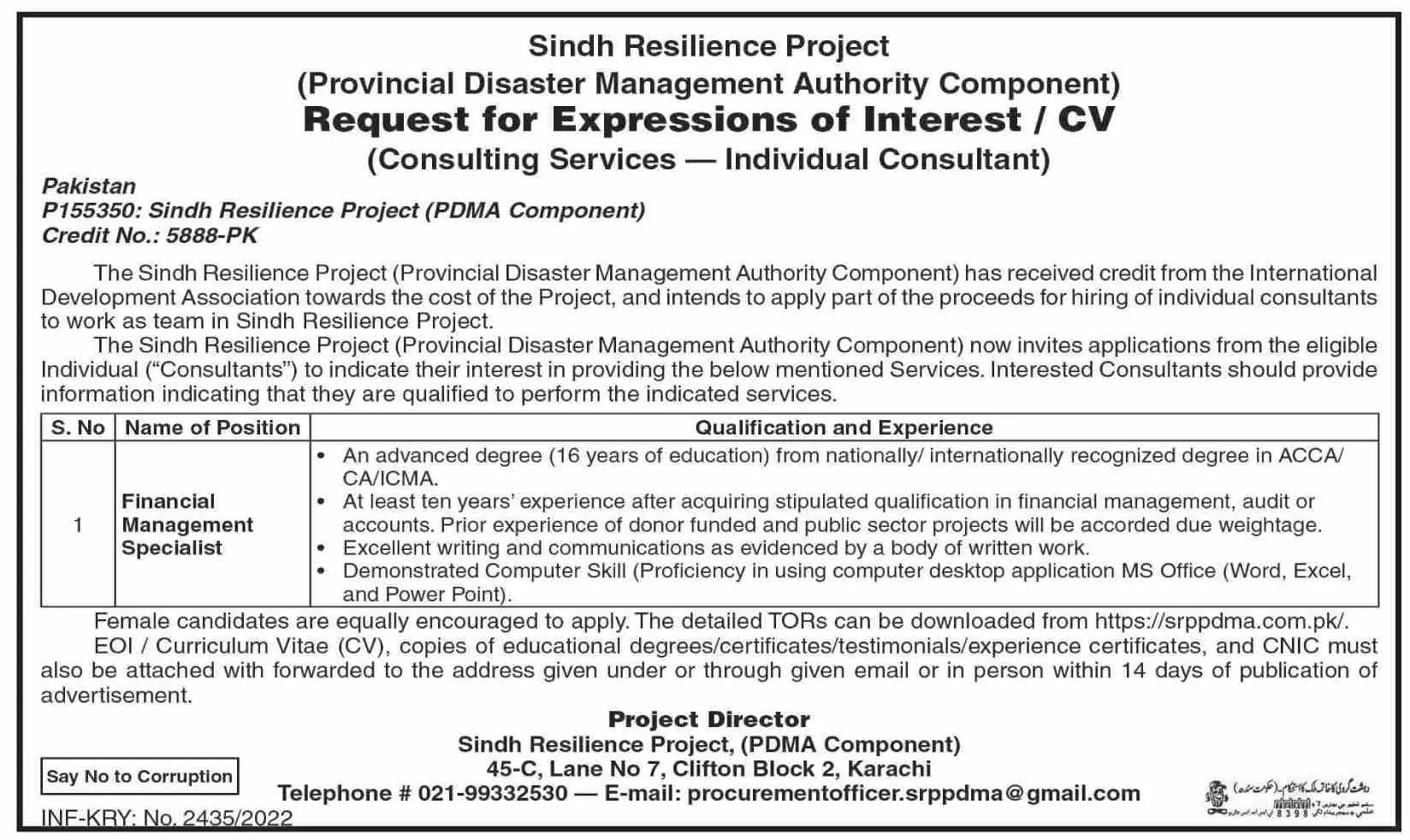 Sindh Resillience Project Consultant Karachi 2022 announce the Contract career opportunities for the post of See Below Ad in Sindh, Karachi for the fresh and experienced candidates on Contract basis who have Check Advertisement degree. Posted date of this post is 19/05/2022 and the last date is 01/06/2022. if you are eligible for this job apply before due date.