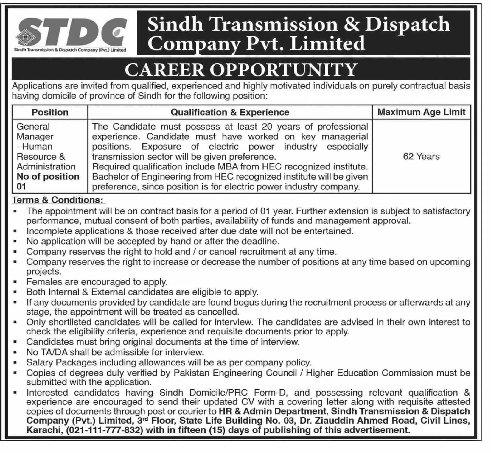 - covering letter along with requisite attested copies of documents through post or courier to HR & Admin Department, Sindh Transmission & Dispatch Company (Pvt.) Limited, 3rd Floor, State Life Building No. 03, Dr. Ziauddin Ahmed Road, Civil Lines, Karachi, (021-111-777-832) with in fifteen (15) days of publishing of this advertisement.