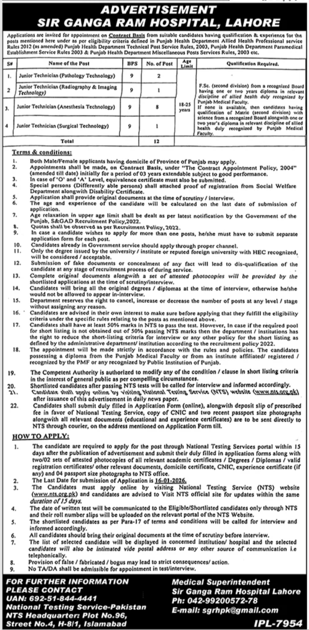 Sir Ganga Ram Hospital Lahore Jobs 2025 announce the Contract career opportunities for the post of See Below Ad in Punjab, Lahore for the fresh and experienced candidates on Contract basis who have Check Advertisement degree. Posted date of this post is 27/12/2025 and the last date is 16/01/2026. if you are eligible for this job apply before due date.