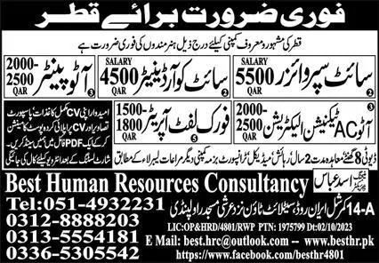 Site Supervisor & Fork Lift Operator Jobs 2023 In Qatar announce the Contract career opportunities for the post of See Below Ad in Qatar for the fresh and experienced candidates on Contract basis who have Check Advertisement degree. Posted date of this post is 05/10/2023 and the last date is 12/10/2023. if you are eligible for this job apply before due date.