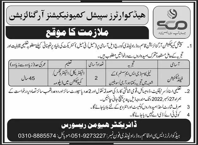 Special Communication Organization SCO Rawalpindi Jobs 2022 announce the Contract career opportunities for the post of See Below Ad in Punjab, Rawalpindi for the fresh and experienced candidates on Contract basis who have Check Advertisement degree. Posted date of this post is 20/12/2022 and the last date is 27/12/2022. if you are eligible for this job apply before due date.