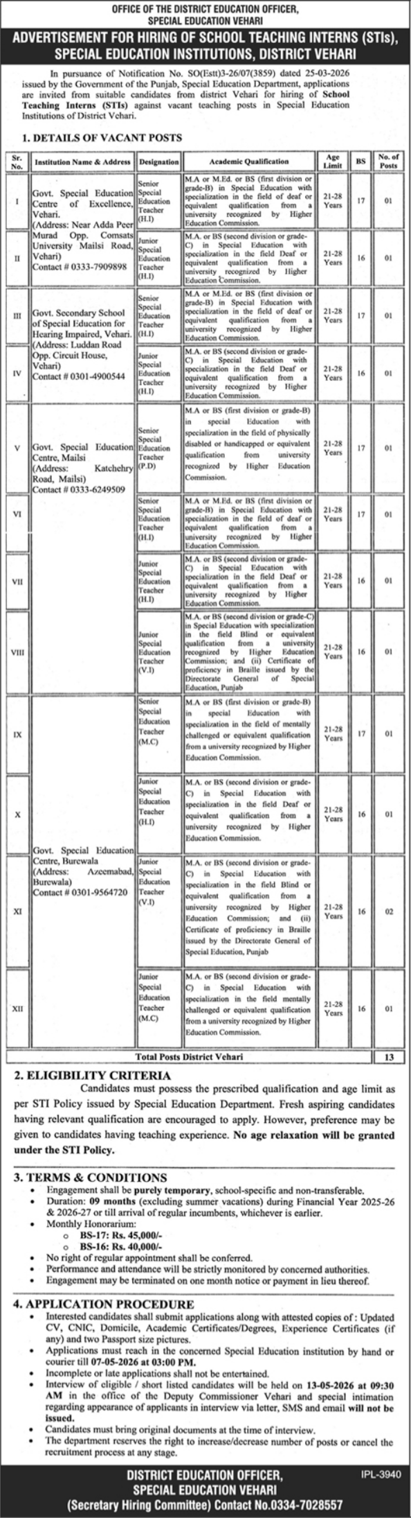 Special Education Institution SEI Vehari Jobs 2026 announce the Contract career opportunities for the post of See Below Ad in Punjab, Vehari for the fresh and experienced candidates on Contract basis who have Check Advertisement degree. Posted date of this post is 24/04/2026 and the last date is 09/05/2026. if you are eligible for this job apply before due date.