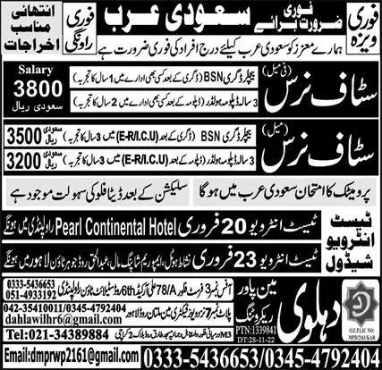 - Dahlawi Manpower Recruiting jobs advertisement dated about 10 February 2023 in daily Express Newspaper invites application for the vacant post of female staff nurse, staff nurse, nurse and male nurse in Makkah, riyadh Saudi Arabia.