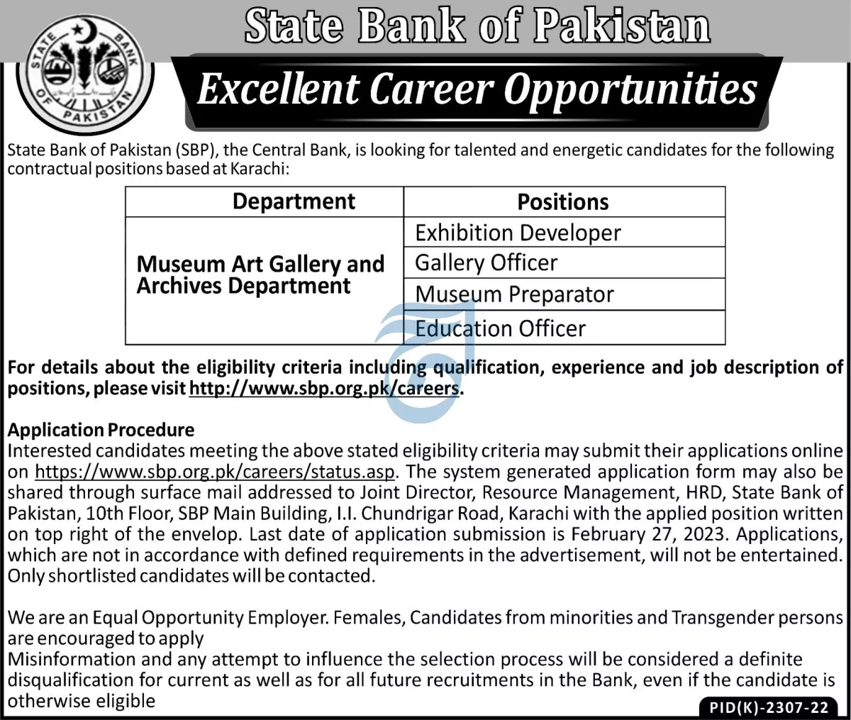 - The SBP seeks young, talented, and energetic professionals as Exhibition Developers, Gallery Officers, Museum Prepretors, and Education Officers. These positions are open in Legal Services Department. These Vacancies are based in Karachi.