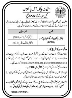 State Bank of Pakistan Karachi Jobs 2026 announce the Contract career opportunities for the post of See Below Ad in Sindh, Karachi for the fresh and experienced candidates on Contract basis who have Check Advertisement degree. Posted date of this post is 08/02/2026 and the last date is 23/02/2026. if you are eligible for this job apply before due date.