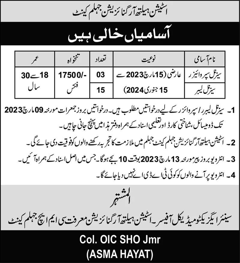 - Station Health Organization is looking for candidates for following posts as per job advertisement published in daily Nawaiwaqt Newspaper of March 1, 2023 for location Jhelum, jhelum Punjab Pakistan: