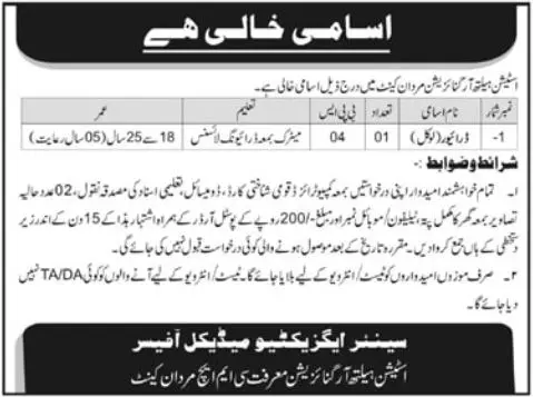 Station Heath Organization Mardan Cantt Jobs 2023 announce the Contract career opportunities for the post of See Below Ad in Khyber Pakhtunkhwa, Mardan for the fresh and experienced candidates on Contract basis who have Check Advertisement degree. Posted date of this post is 16/02/2023 and the last date is 02/03/2023. if you are eligible for this job apply before due date.