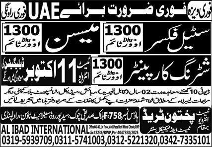 Steel Fixer And Mason Jobs in United Arab Emerities 2025 announce the Contract career opportunities for the post of See Below Ad in United Arab Emirates for the fresh and experienced candidates on Contract basis who have Check Advertisement degree. Posted date of this post is 07/10/2025 and the last date is 11/10/2025. if you are eligible for this job apply before due date.