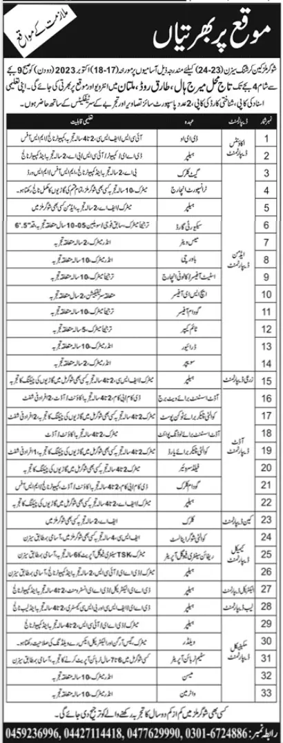 - Vacant posts including transport incharge, godown clerk, mason, quality checker for yard, water man, clerk, data entry operator deo, bawarchi, quality sugar analyst, driver, field surveyor, steam turbine operator, audit assistant weight bridge, quality checker for token post, audit assistant for loading point, refine centrifugal operator, godown officer, welder, hec officer, sweeper, estate officer colony incharge, security guard, time keeper, mess waiter, gate clerk and helper are announced in Sugar Mill Multan, multan Punjab Pakistan as per 13 October 2023 advertisement in daily Jang Newspaper.